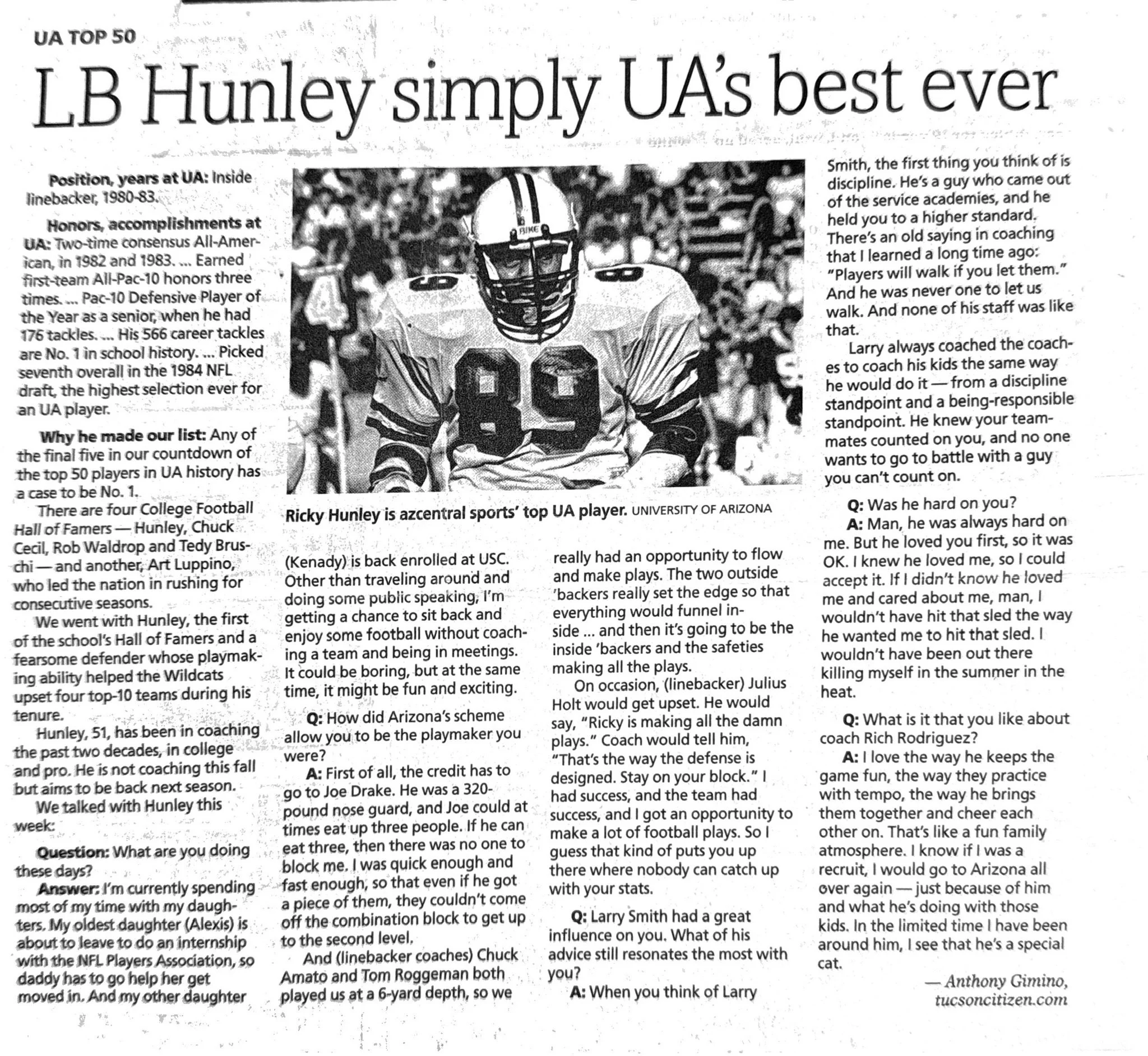 Ricky Cardell Hunley is a College Football Hall of Famer, NFL veteran, and respected coach whose influence reaches far beyond the field. Born in Petersburg, Virginia, he became the first University of Arizona Wildcat to earn consensus All-American honors twice, setting the foundation for a seven-season NFL career and a lifetime dedicated to leadership and service. Today, Ricky mentors student athletes, supports community programs, and plays a vital role in shaping the culture of Arizona football.